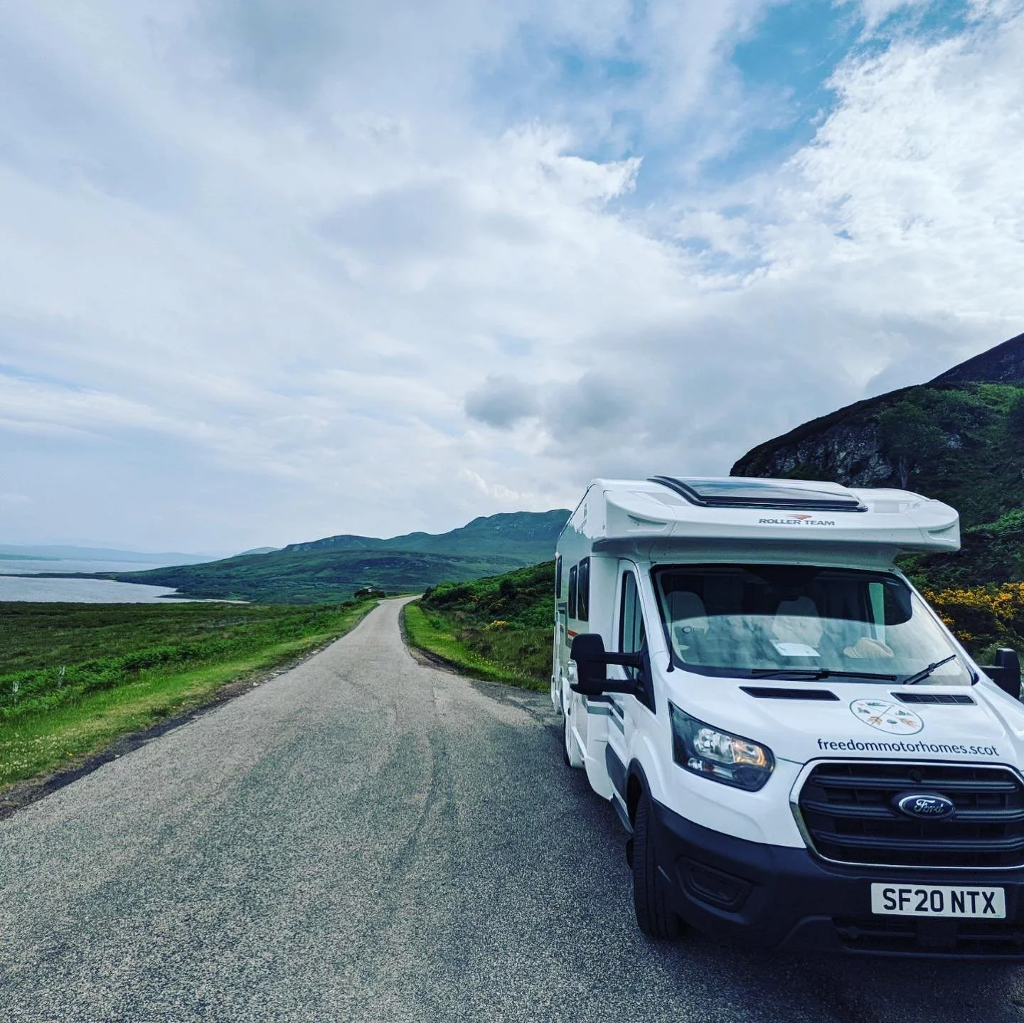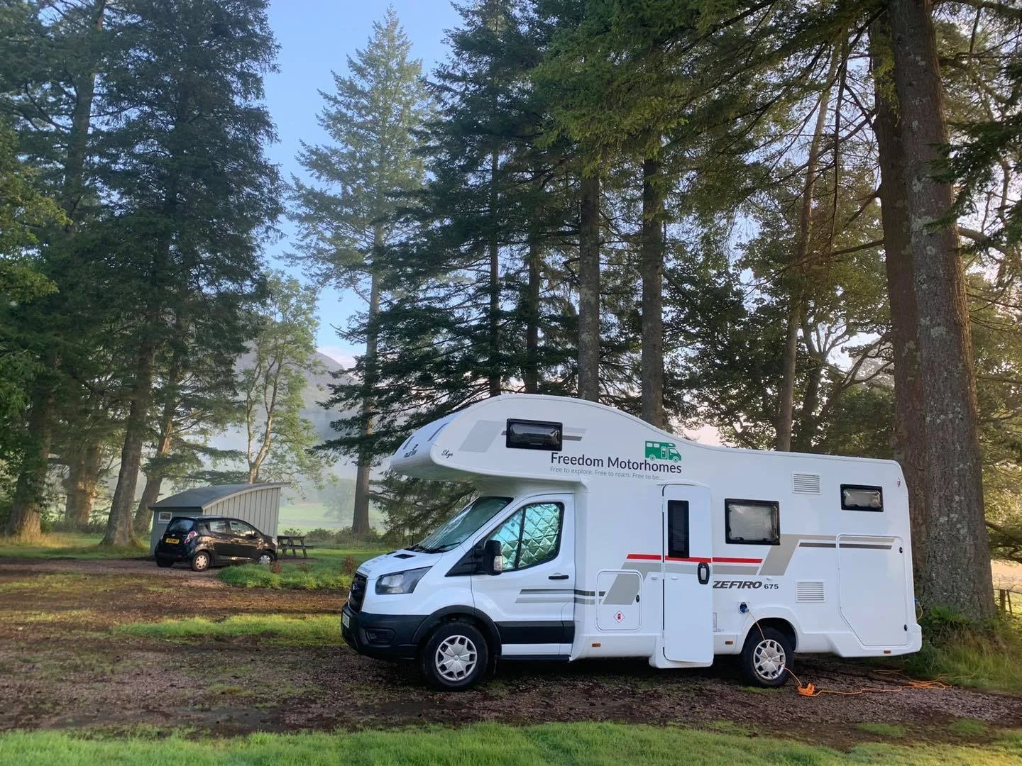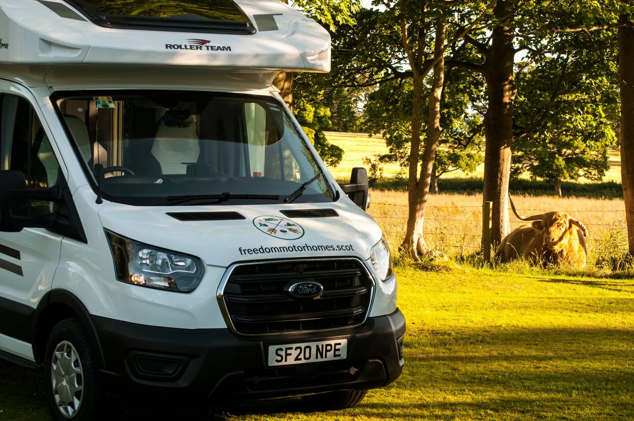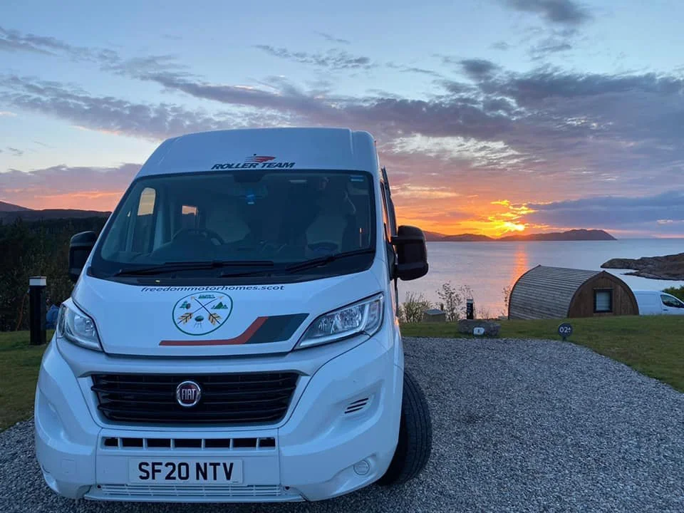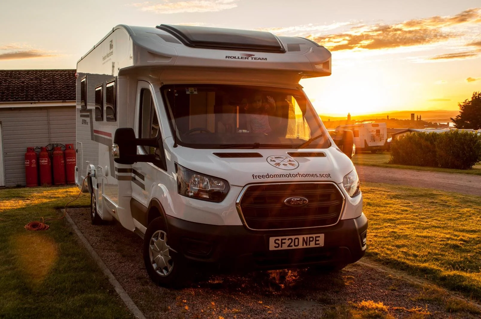 Campervan parked on grass at sunset with "freedommotorhomes.scot" branding, and several red gas cylinders nearby.