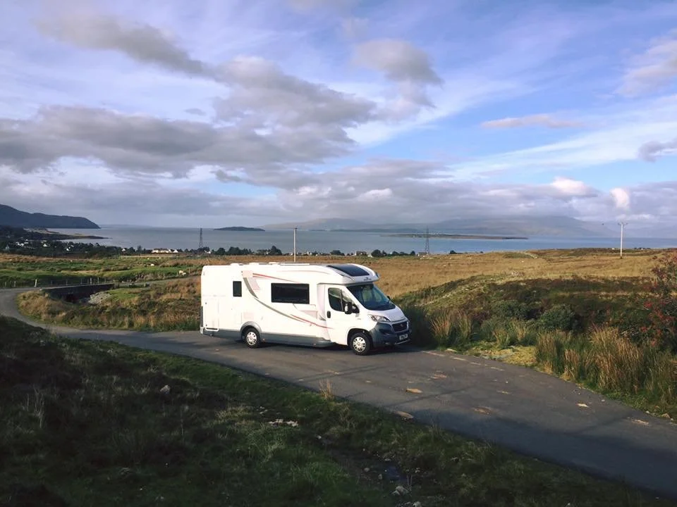RV parked on a scenic road near a coastal area with hills and sea in the background.