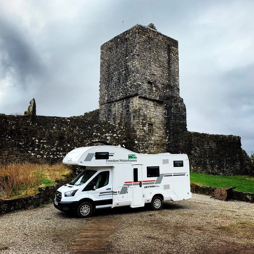 White motorhome parked in front of an ancient stone castle with a cloudy sky.