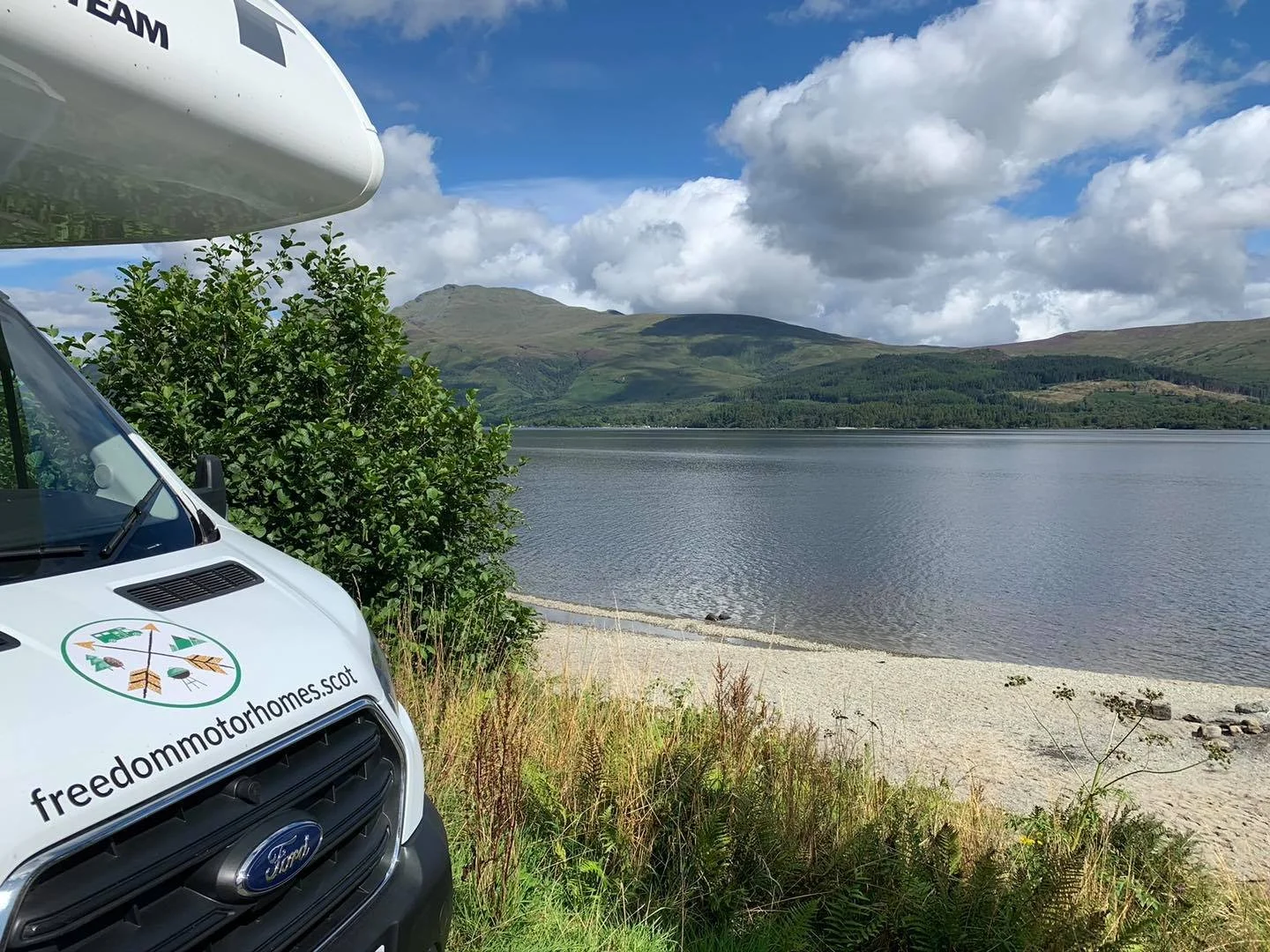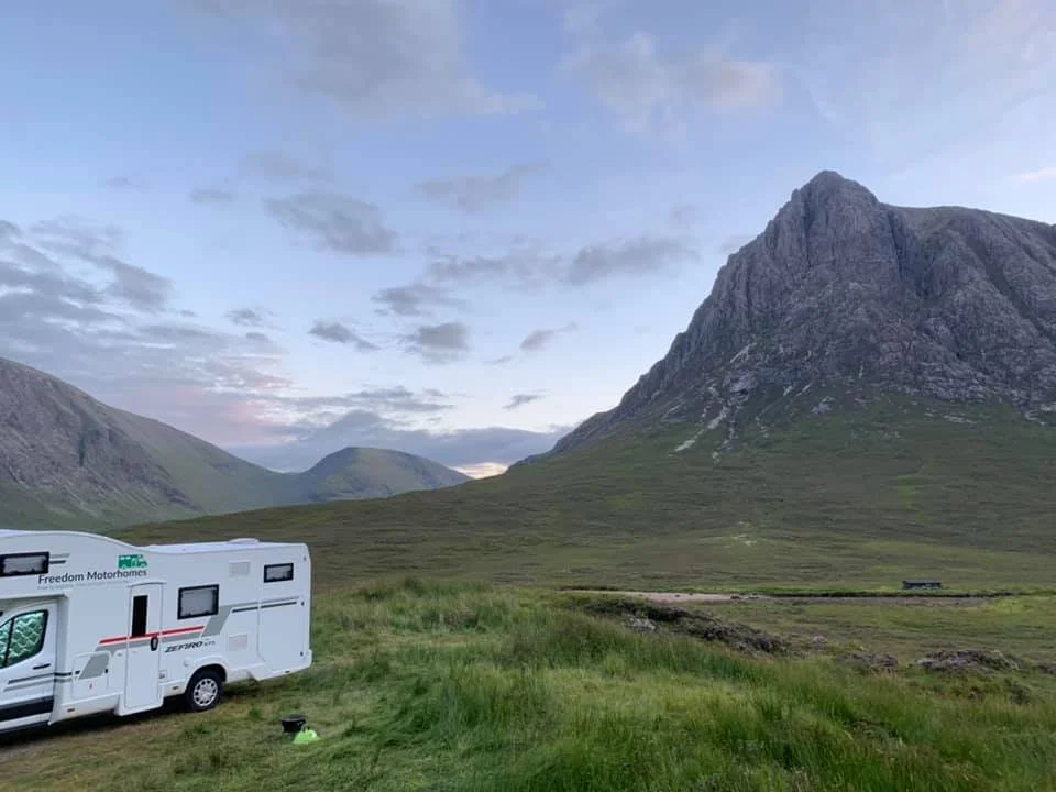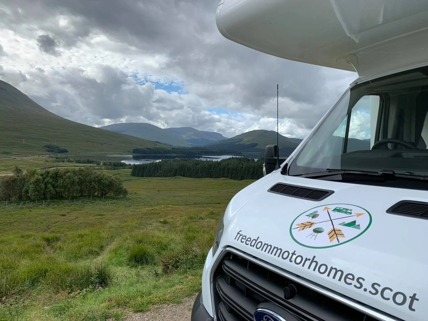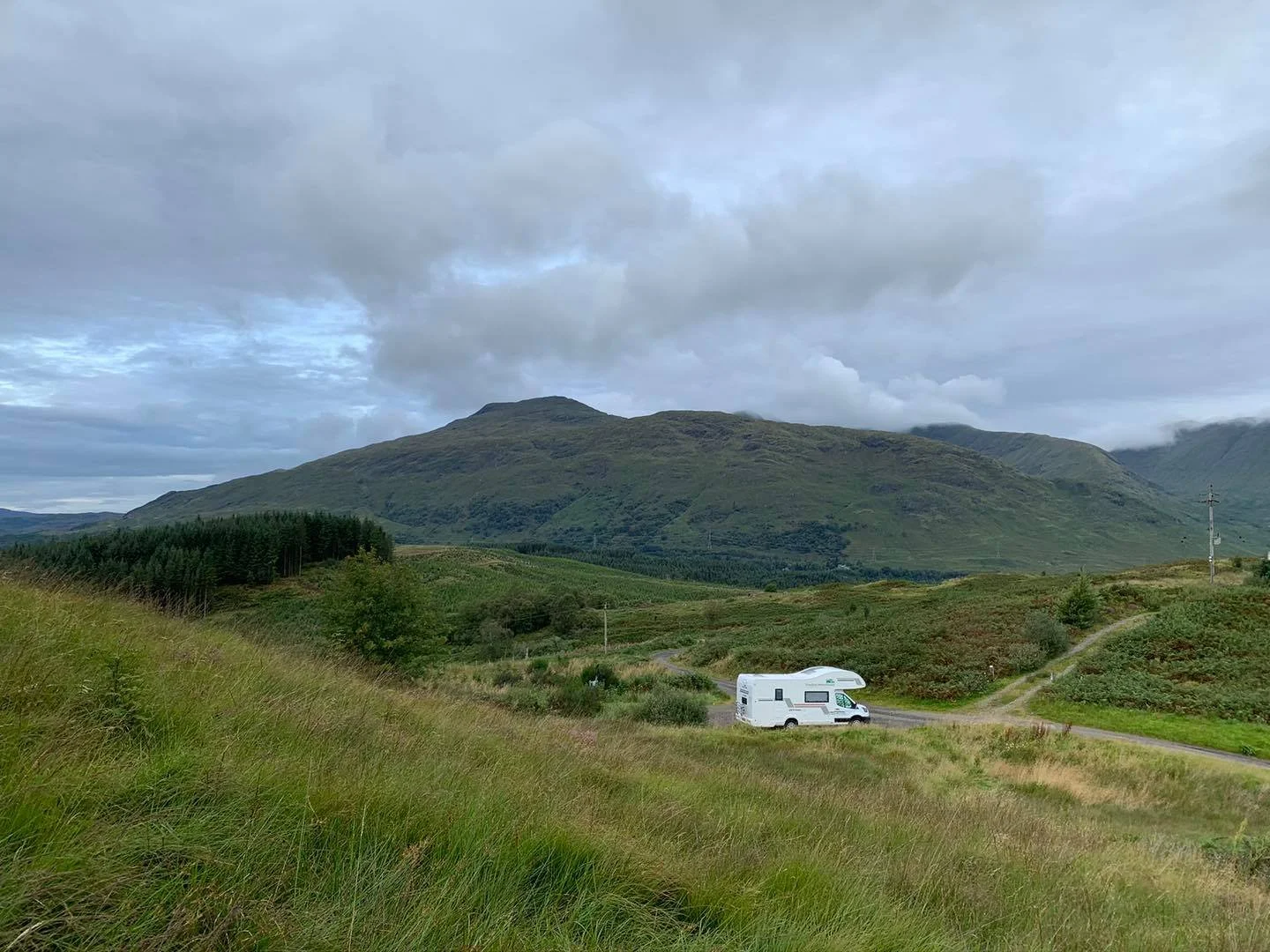 Motorhome in Scottish Highlands landscape with mountains, lake, and cloudy sky.