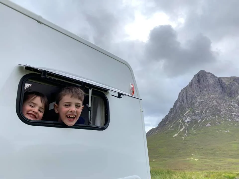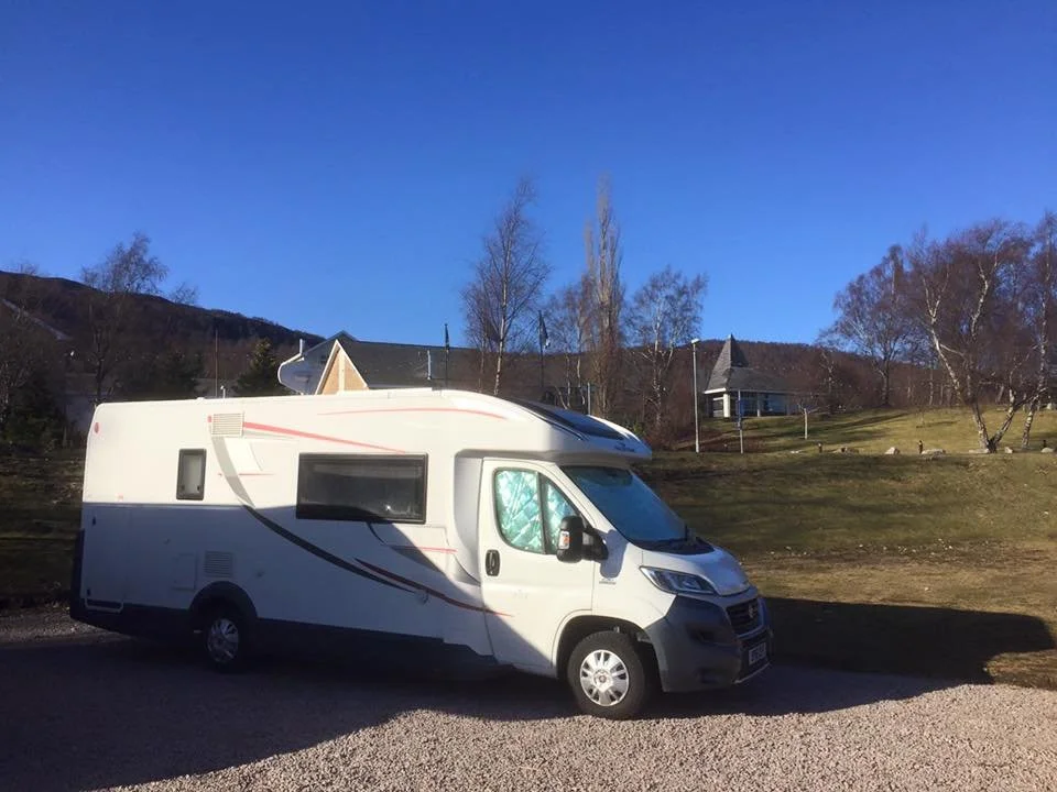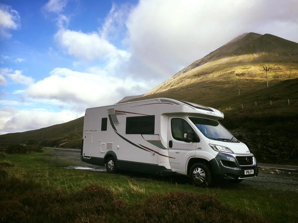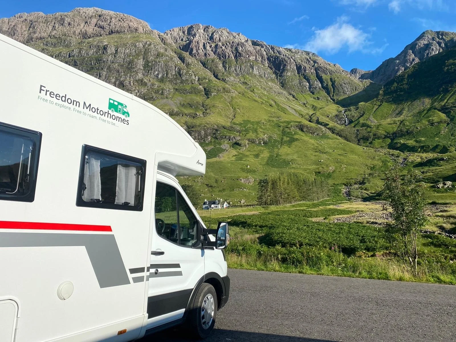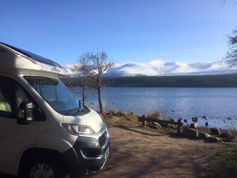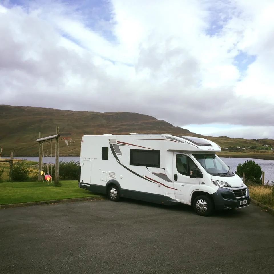Motorhome in Scottish Highlands landscape with mountains, lake, and cloudy sky.