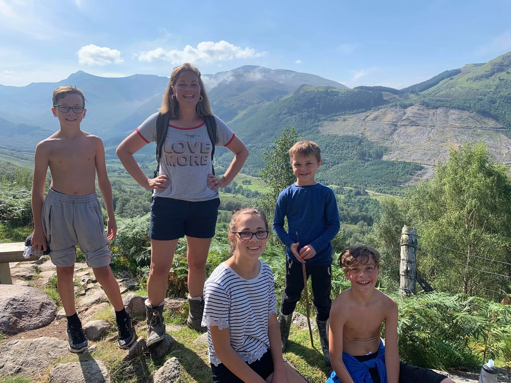 Scenic view of Glencoe Valley with mountains and moorland under a blue sky with clouds.