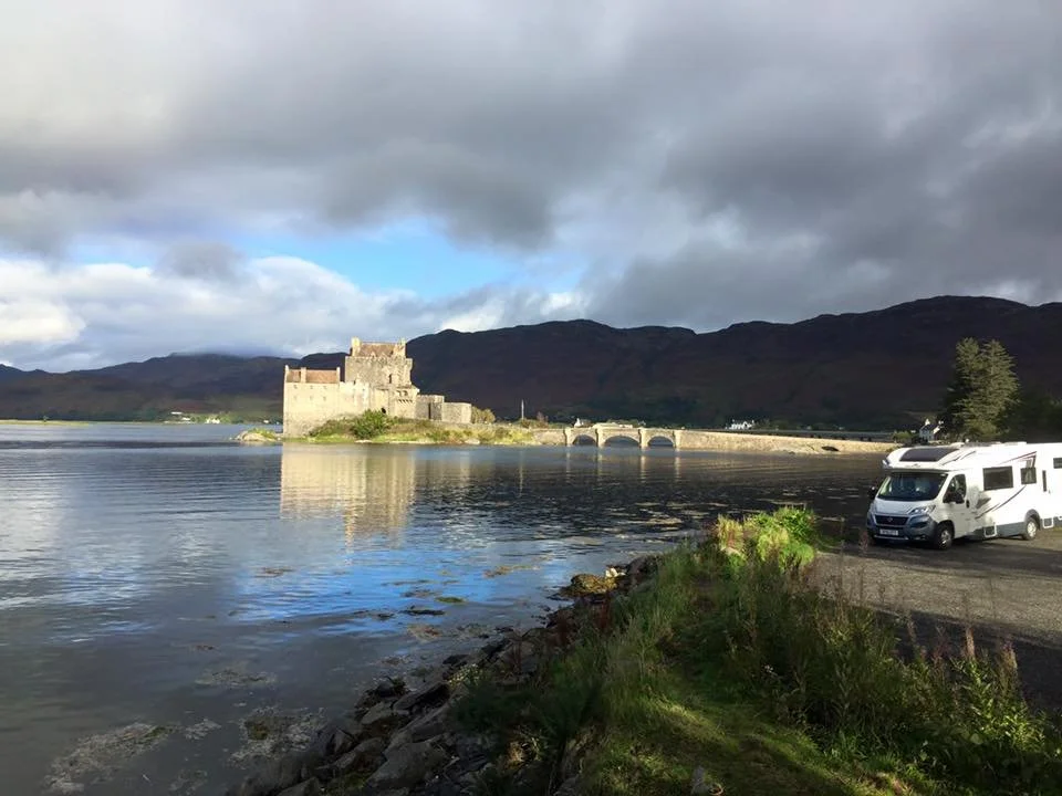 Scenic view of a castle beside a calm lake with mountains in the background under a cloudy sky, and a white RV parked near the shore.