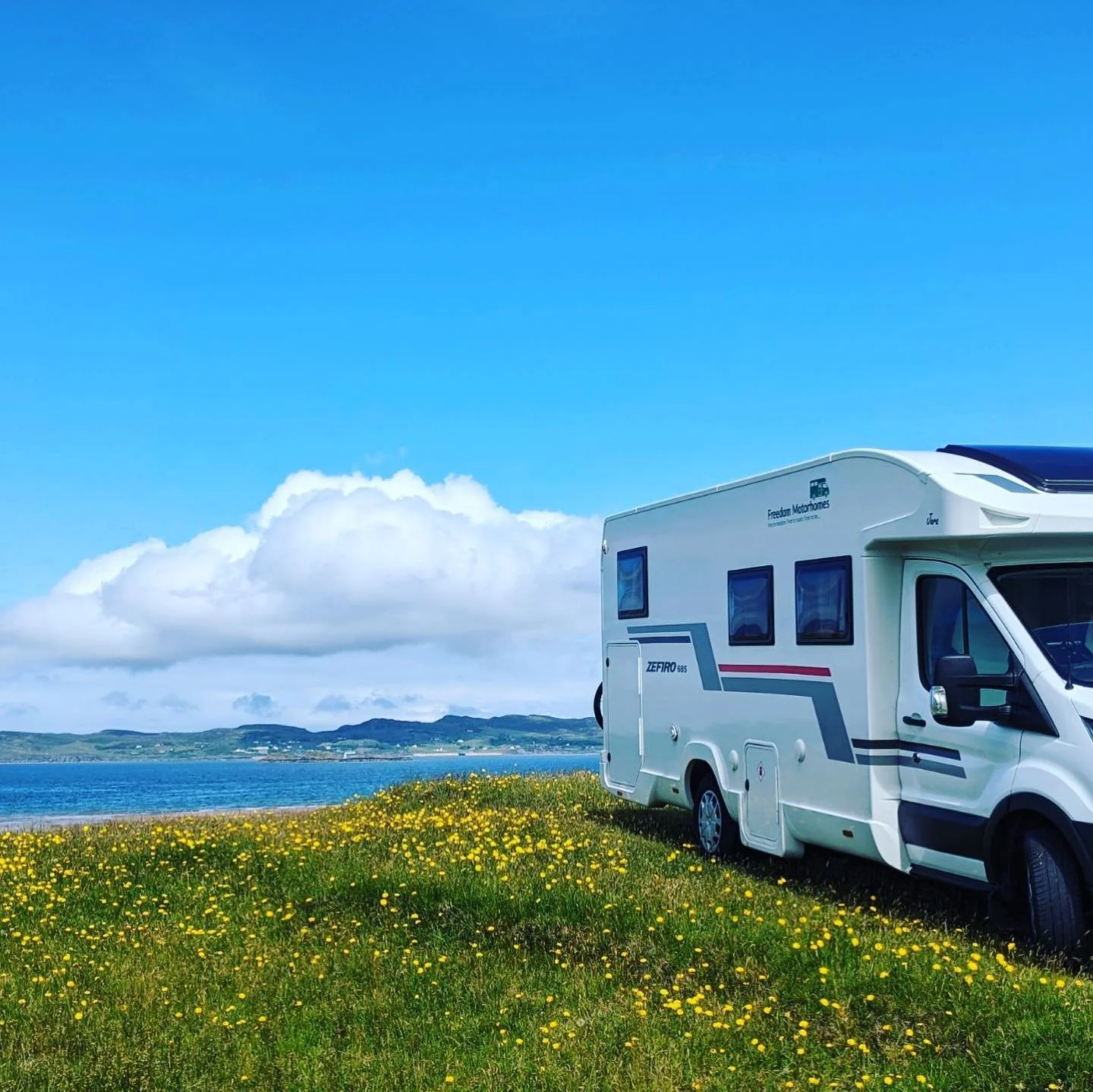 Motorhome parked on grassy field with yellow flowers, near a coastline with blue sky and clouds in the background.