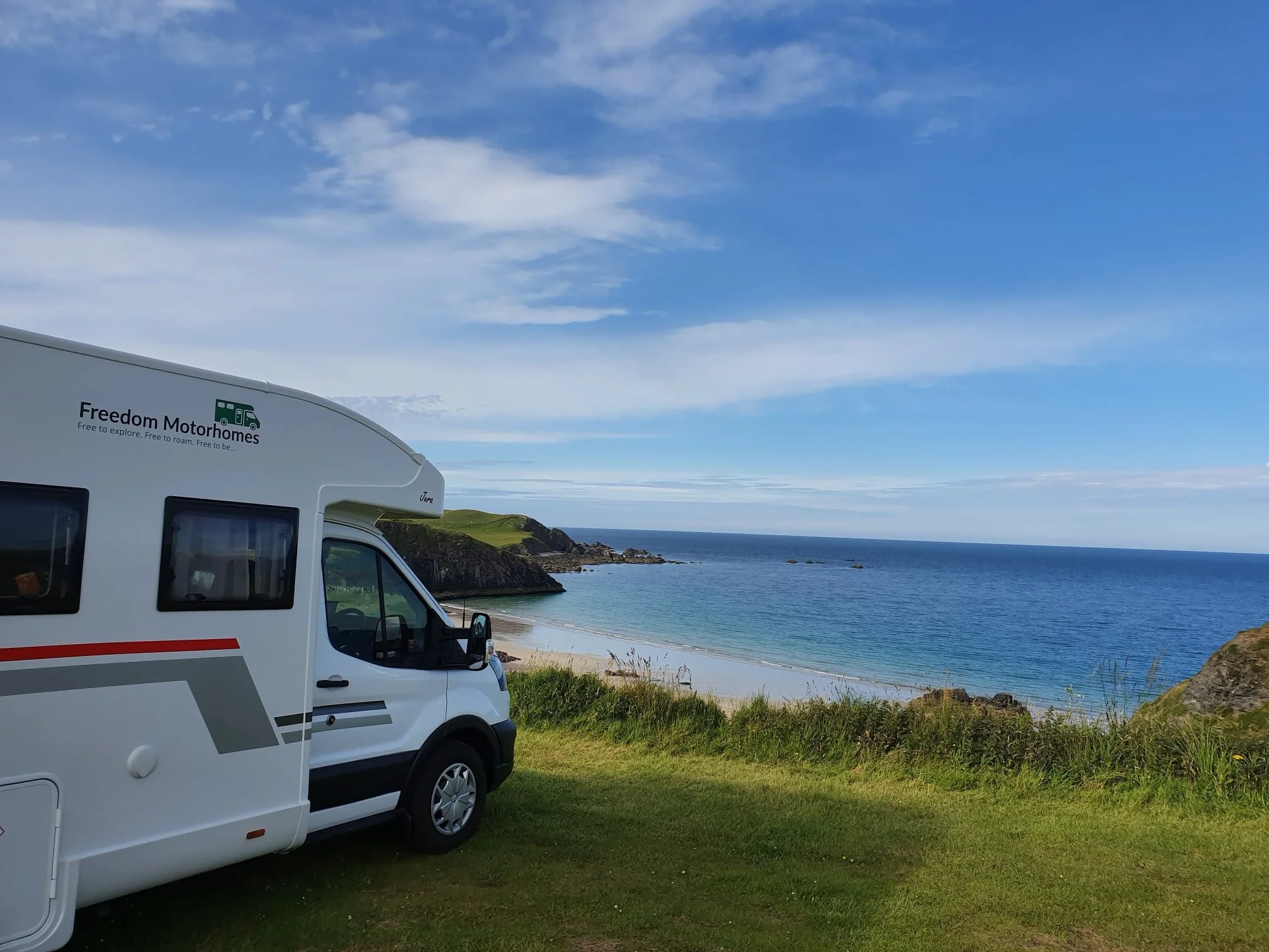 Motorhome parked on grassy hill overlooking a sandy beach and blue ocean under a clear sky.