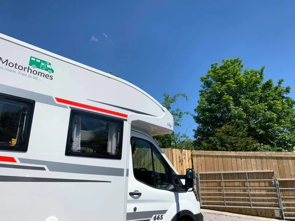White motorhome parked in front of a wooden fence with trees and blue sky in the background.