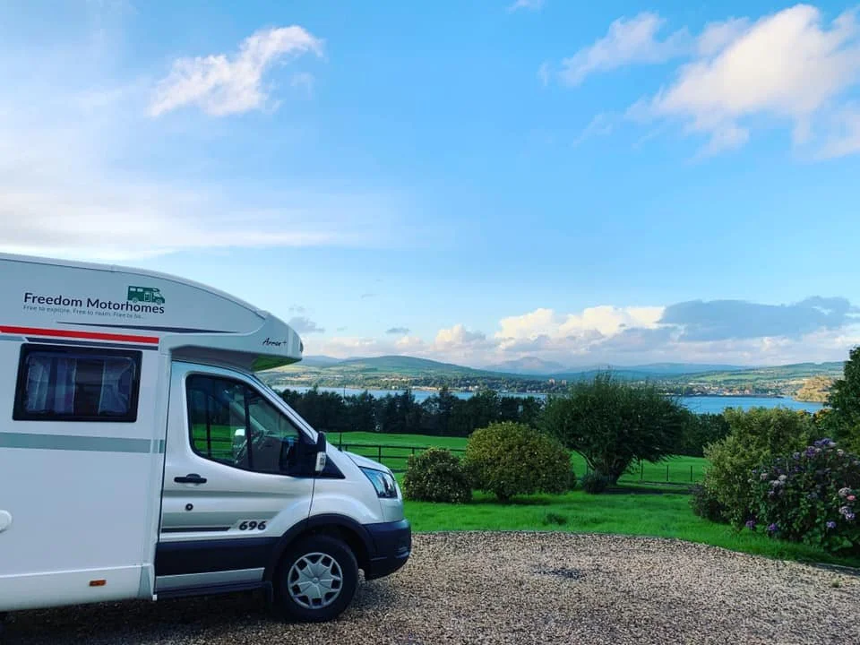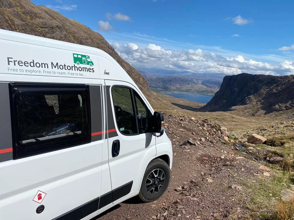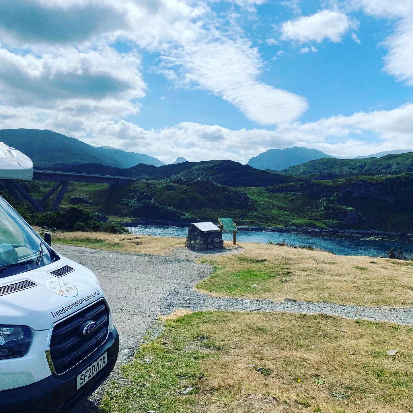 A scenic landscape with a partly cloudy sky, mountains in the background, and a river. In the foreground, there is a white van with "freedommotorhomes.co.uk" on it, parked on a dirt and grass area. A viewpoint sign and an information plaque are nearb