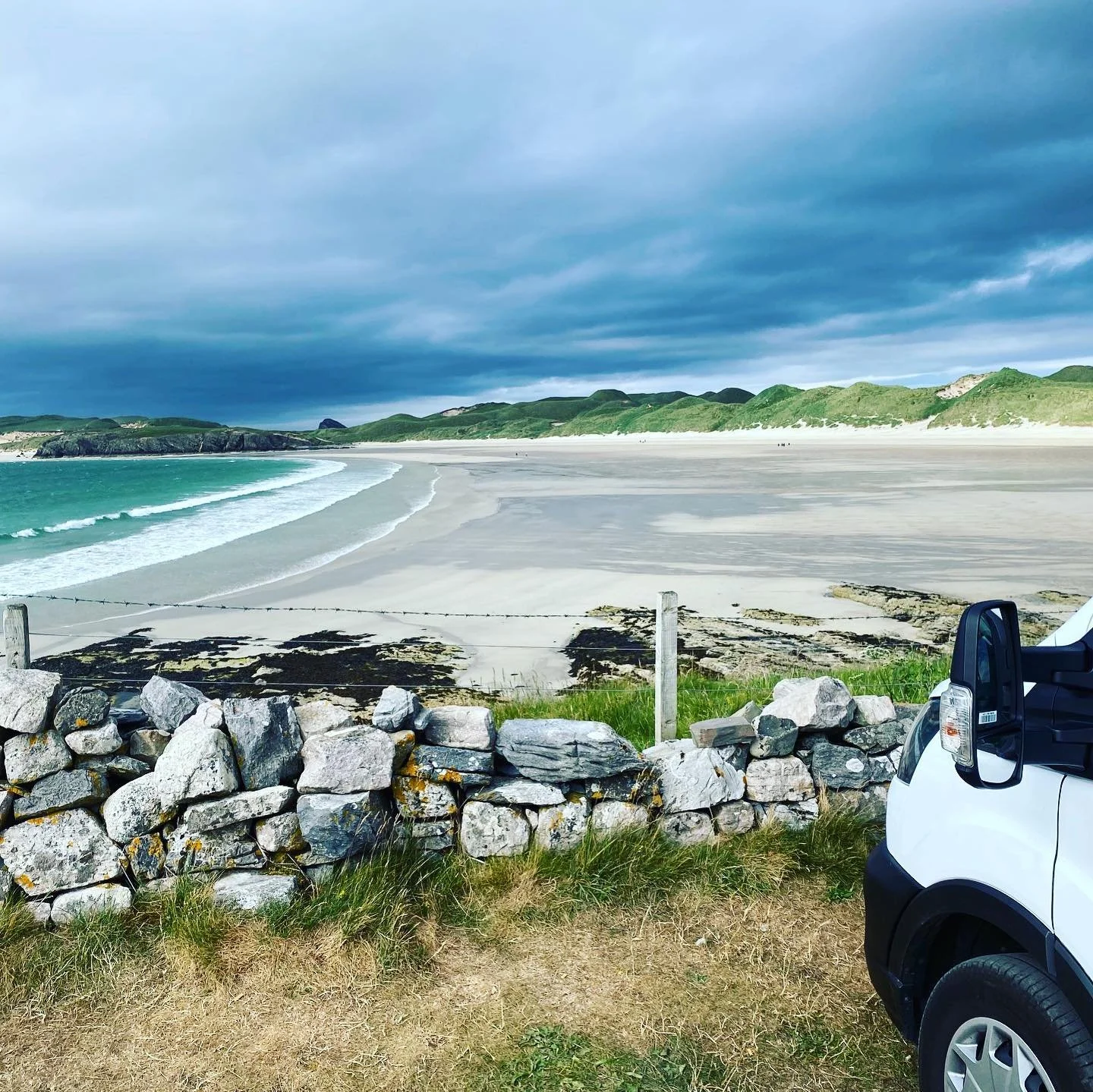 Van parked near a stone wall with a view of a sandy beach, turquoise ocean waves, and lush green hills under a cloudy sky.