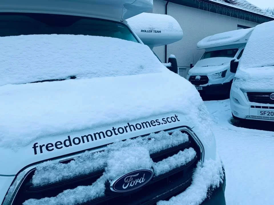 Snow-covered motorhomes parked, with visible website freedommotorhomes.scot on a vehicle.