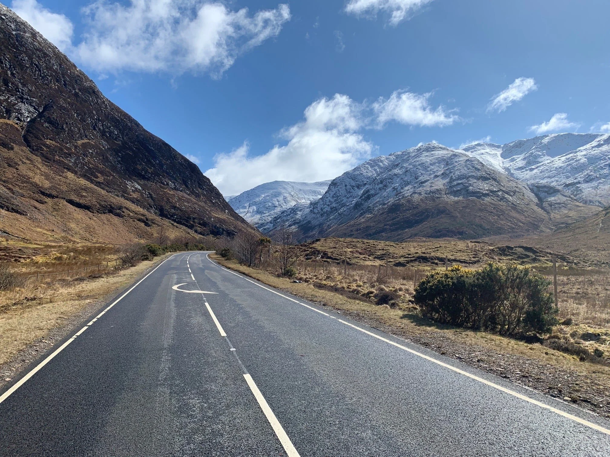 Scenic view of Glencoe Valley with Two Mountains and a Winding Road