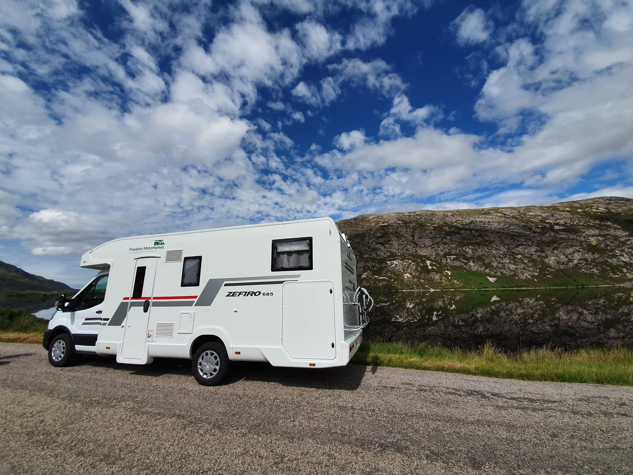 Motorhome parked near a scenic lake with mountains in the background, clear blue sky with fluffy clouds.