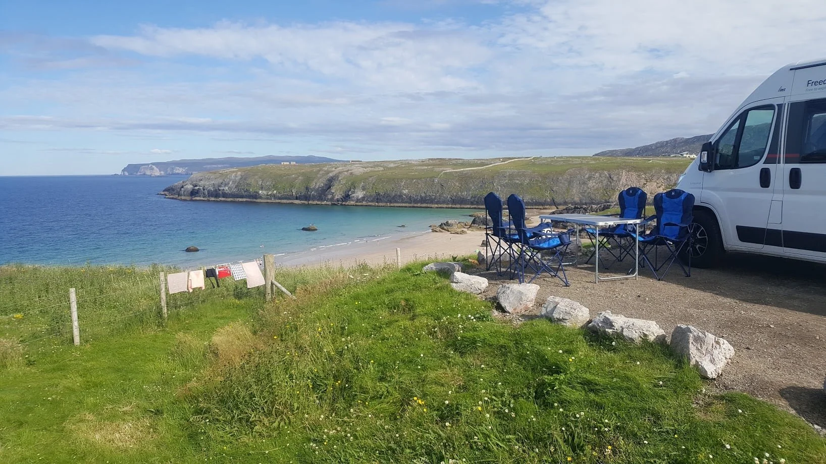 Camper van parked on a coastal cliff, near a beach with clear blue water, grassy terrain, a fence with towels hanging, and blue camping chairs around a table.