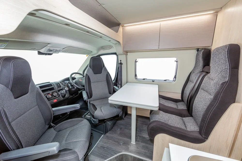 It has the flexible dinette with swing-out table, and swivel captains chairs to create a relaxation area and ideal mealtime spot. This new van has the updated cab interior, with the large garage space below the rear bed with the pull out trays, and as always comes with the quality upholstery.